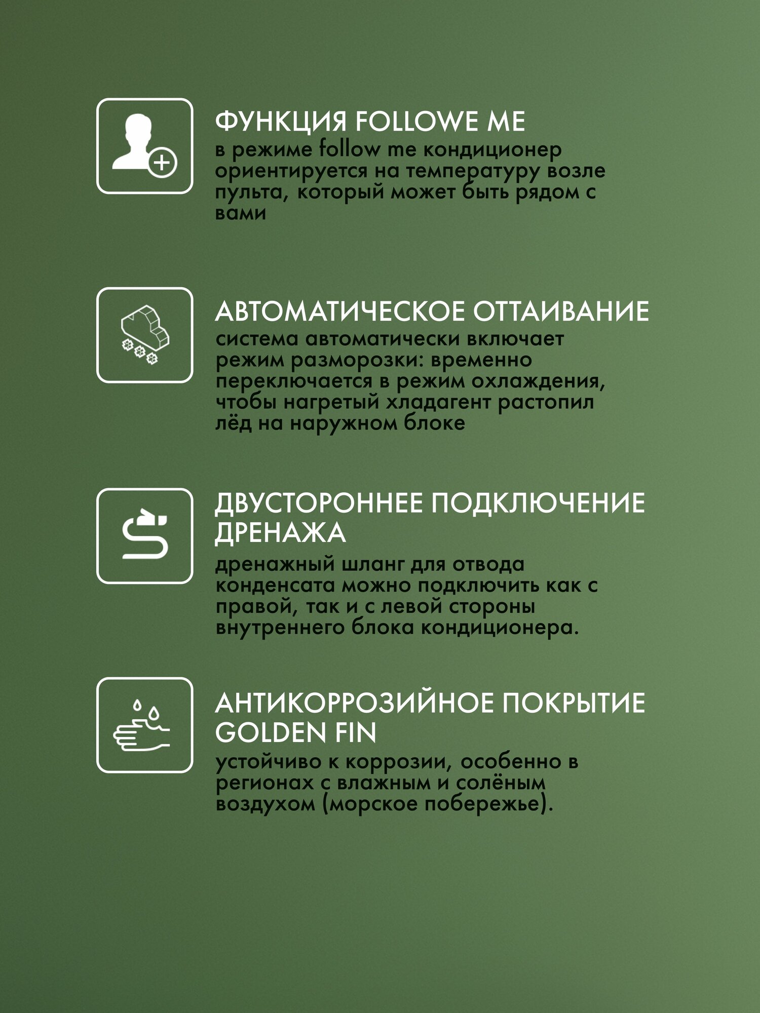 Сплит-система Бирюса B-09LPR/B-09LPQ Legend разработана для эффективного охлаждения и обогрева помещений площадью до 25 м², обеспечивая стабильную работу и современный комфорт в любое время года. Модель оснащена высокоэффективным компрессором GMCC-Toshiba, который гарантирует надёжную и экономичную работу с низким уровнем шума. Кондиционер поддерживает основные режимы: охлаждение, обогрев, вентиляция, осушение и автоматический режим, позволяя адаптироваться к любым погодным условиям. Русифицированный пульт управления делает настройку параметров простой и понятной, обеспечивая удобство эксплуатации. Система 4D-Air Flow с автоматическим качанием жалюзи по вертикали и горизонтали распределяет воздушный поток по всей комнате, создавая равномерный микроклимат. Скрытый дисплей придаёт устройству стильный и лаконичный внешний вид, а антикоррозийное покрытие Golden Fin надёжно защищает теплообменник от внешних воздействий, продлевая срок службы оборудования. Функция самоочистки предотвращает образование плесени и скопление загрязнений внутри блока, поддерживая чистоту и свежесть воздуха. Обнаружение утечки хладагента позволяет вовремя выявить неполадки и избежать серьёзных неисправностей. Тёплый старт в режиме обогрева исключает подачу холодного воздуха при запуске, что особенно важно в холодное время года. Функция авторестарта восстанавливает работу кондиционера с сохранением всех настроек после отключения питания. Запоминание положения жалюзи, режим TURBO для быстрого охлаждения, ночной режим для тихой работы, фильтр высокой плотности и дополнительный фильтр холодного катализа способствуют улучшению качества воздуха и создают комфортную атмосферу в помещении. Технология Follow Me позволяет кондиционеру ориентироваться на температуру в зоне нахождения пульта, автоматически подстраивая параметры для персонального комфорта. Автоматическое оттаивание предотвращает образование наледи на наружном блоке и обеспечивает стабильную работу при температуре до -7°C. Таймер, функция самодиагностики и двустороннее подключение дренажа расширяют удобство использования и монтажа. Кондиционер работает на экологичном хладагенте R32, который отличается высокой эффективностью и безопасностью. Бирюса B-09LPR/B-09LPQ Legend — это надёжное и доступное решение для создания комфортного микроклимата в квартирах, офисах и других жилых помещениях.